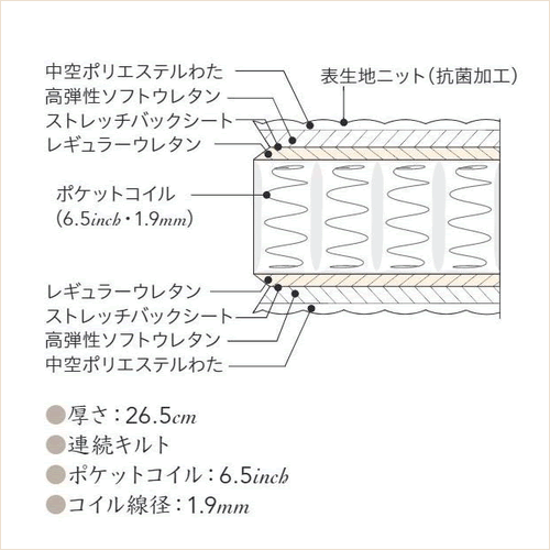並行配列はコイル同士の摩擦が少なく、マットレスの両端や上下部分の欠落を防ぎ、マットレス周囲の強度が保てますたくさんのコイルが作り出す理想の体圧分散ポケットコイルは、直径の小さなコイル(59mm)を使用。